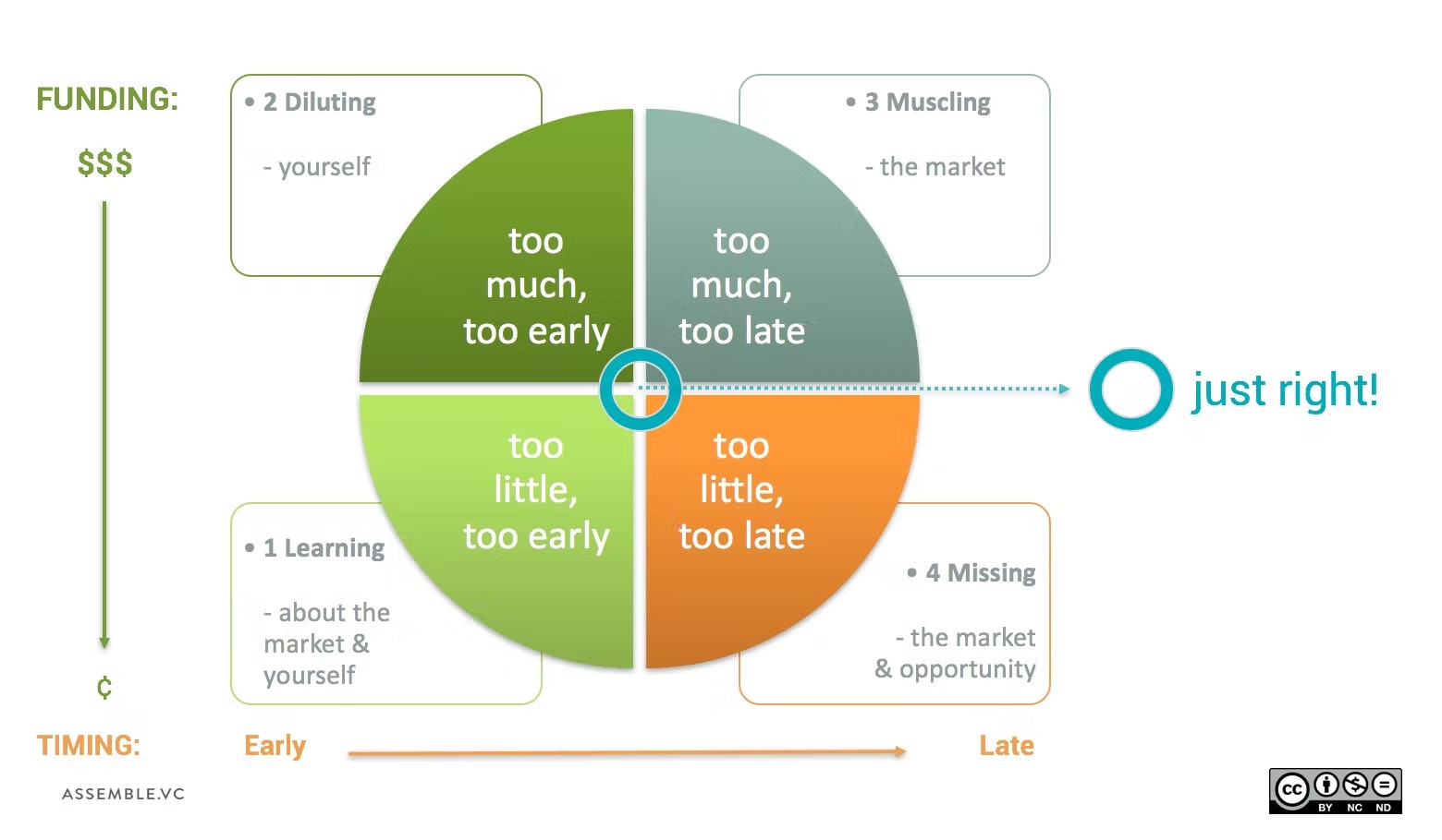 Probably better not to raise too much until you both understand product market fit and your own propensity for risk Raising too much too early can be good if you’re risk averse, but it requires real discipline not to overspend as you figure out the right way to pace your spend to the emergence of the market. . Some VCs even try to scare competitors off by choosing to use exclamative funding to aggressively possess a space. Again it can work but don’t bluff if you’ve not got the strong overall company-market-fit hand! Too little, too late and you guessed it, you’re just going to miss the market opportunity 🙁 Think about how you can move from bottom left in the diagram to the center, by defining tight iterations of customer and market learning. Like most things in the startup world it will be an iterative learning process that also includes and is specific to you, your team, value proposition, go to market, and you business model. Don’t try to prove too much in each step. Reduce execution variables. Then recognize: